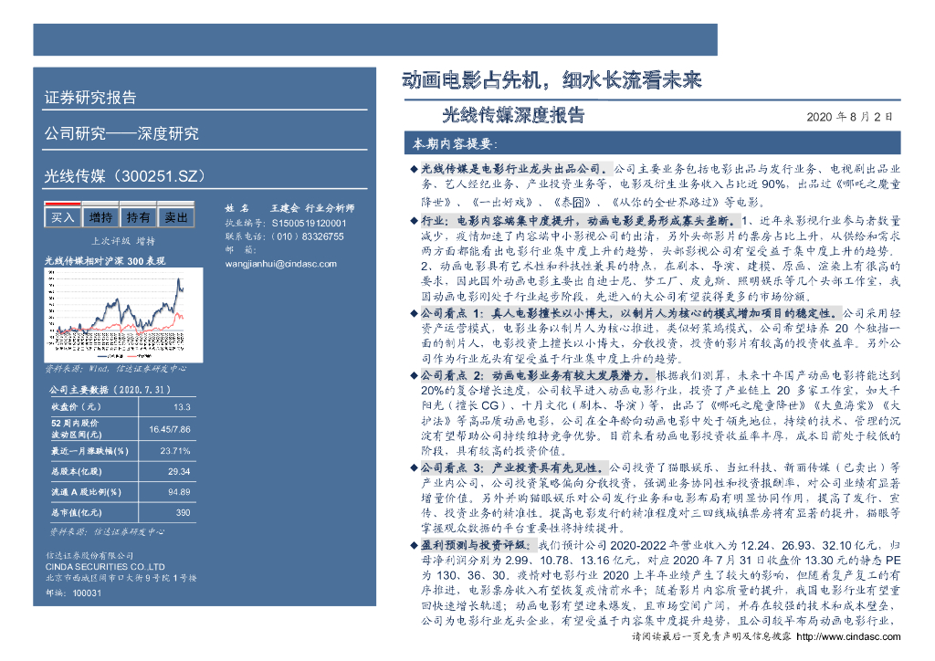 信达证券:光线传媒(300251)-深度报告:动画电影占先机,细水长流看未来.pdf