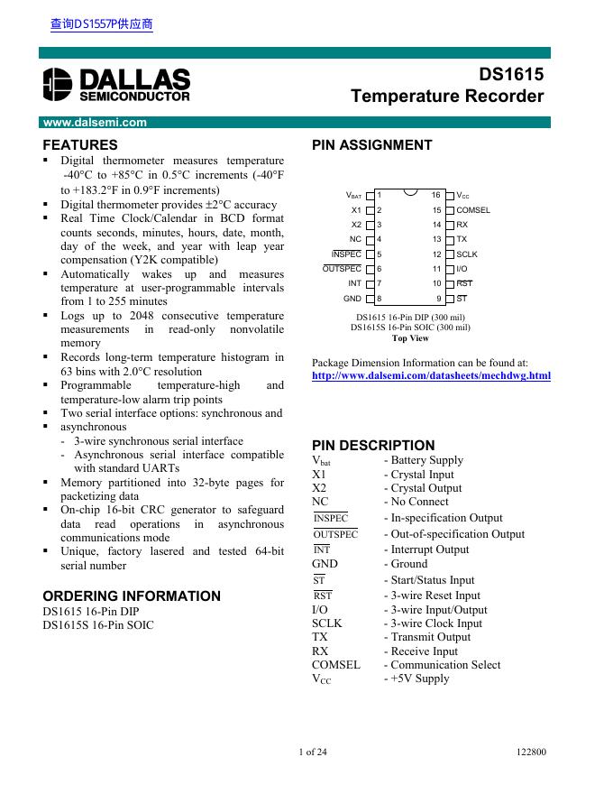 DALLSA DS1615 Temperature Recorder 数据手册.pdf