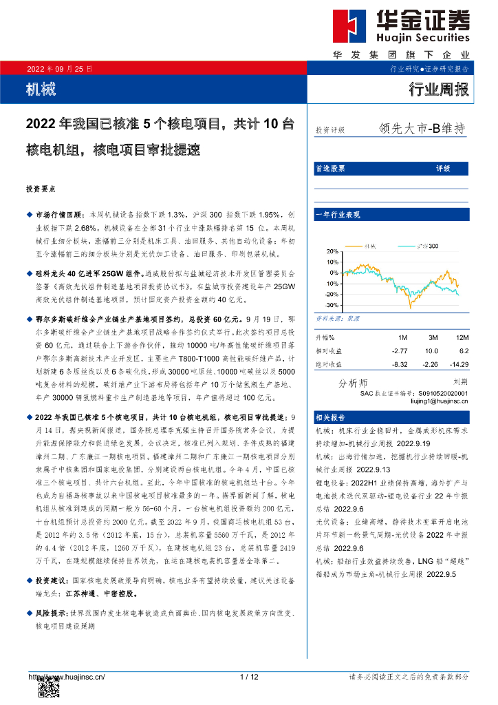 华金证券:机械行业周报:2022年我国已核准5个核电项目,共计10台核电机组,核电项目审批提速.pdf