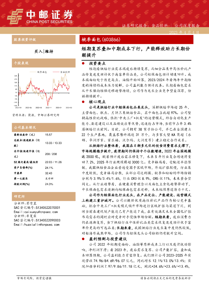 中邮证券:桃李面包(603866)-短期复苏叠加中期成本下行,产能释放助力长期份额提升.pdf