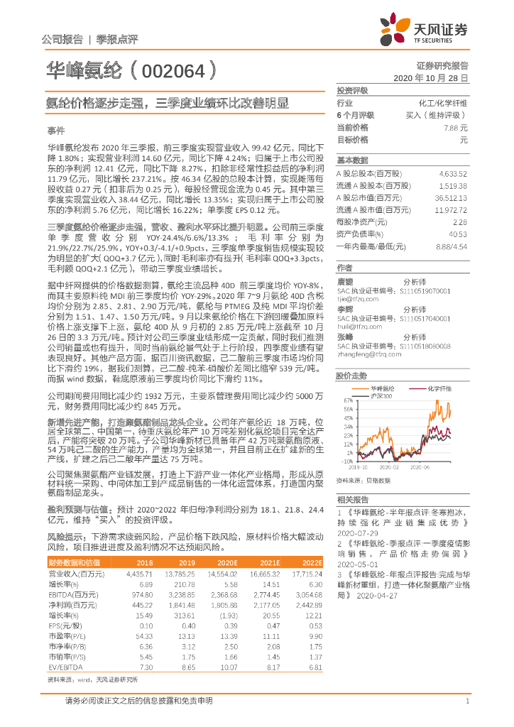 天风证券:华峰氨纶(002064)-氨纶价格逐步走强,三季度业绩环比改善明显.pdf