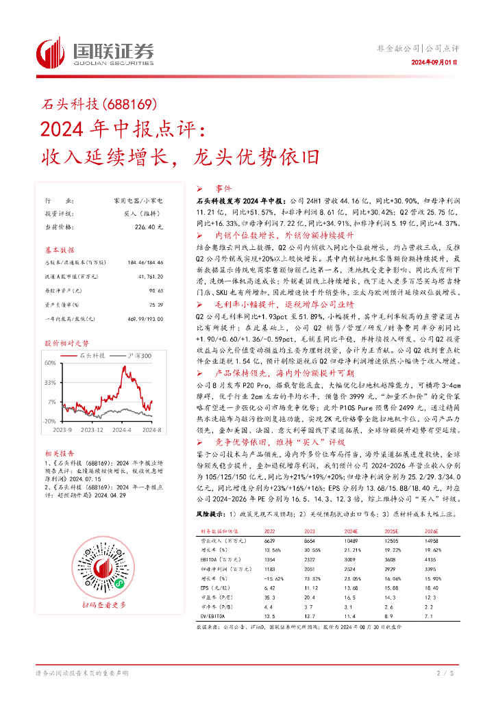 国联证券:石头科技(688169)-2024年中报点评:收入延续增长,龙头优势依旧.pdf