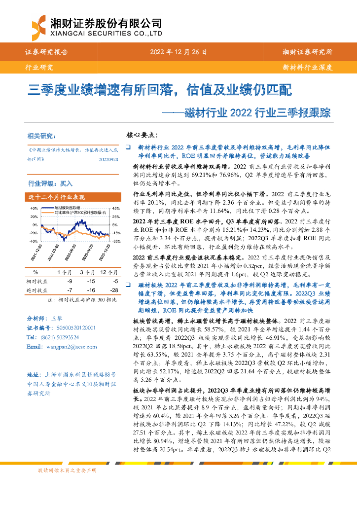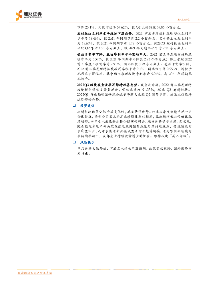 湘财证券:磁材行业2022行业三季报跟踪:三季度业绩增速有所回落,估值及业绩仍匹配.pdf