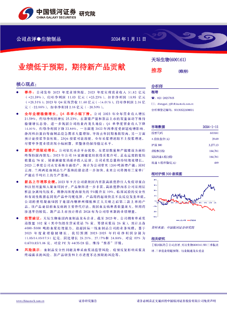 中国银河:天坛生物(600161)-业绩低于预期,期待新产品贡献.pdf