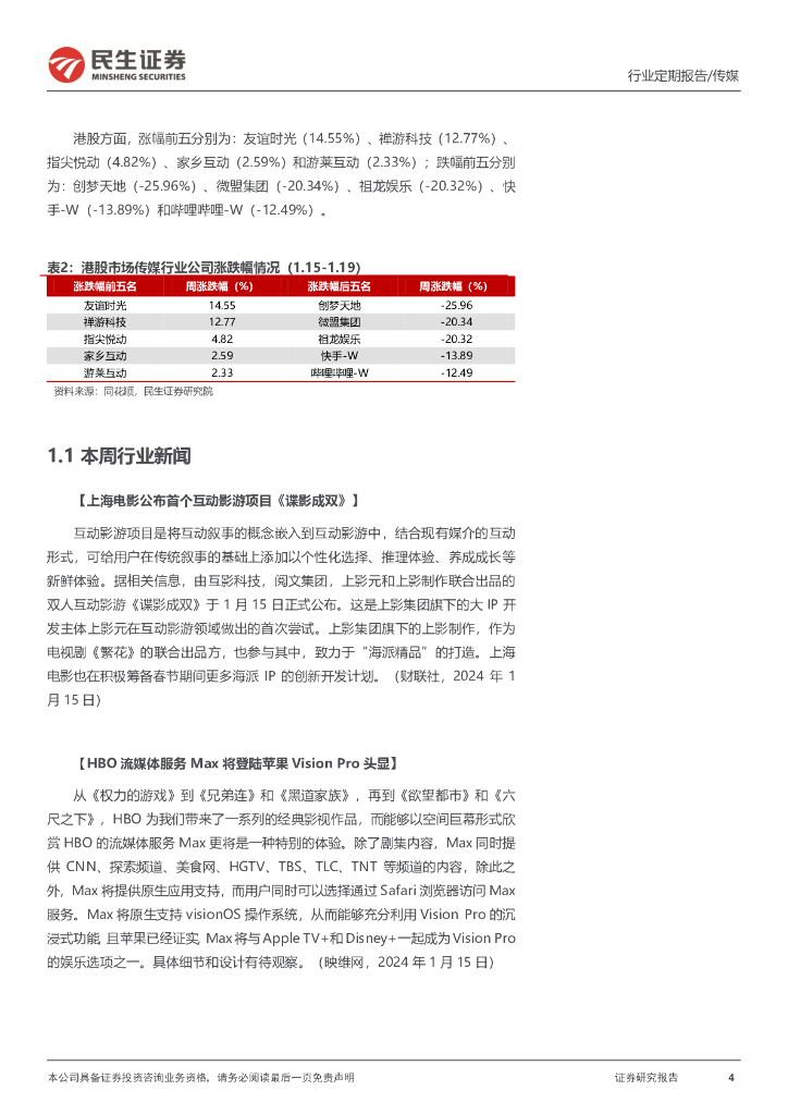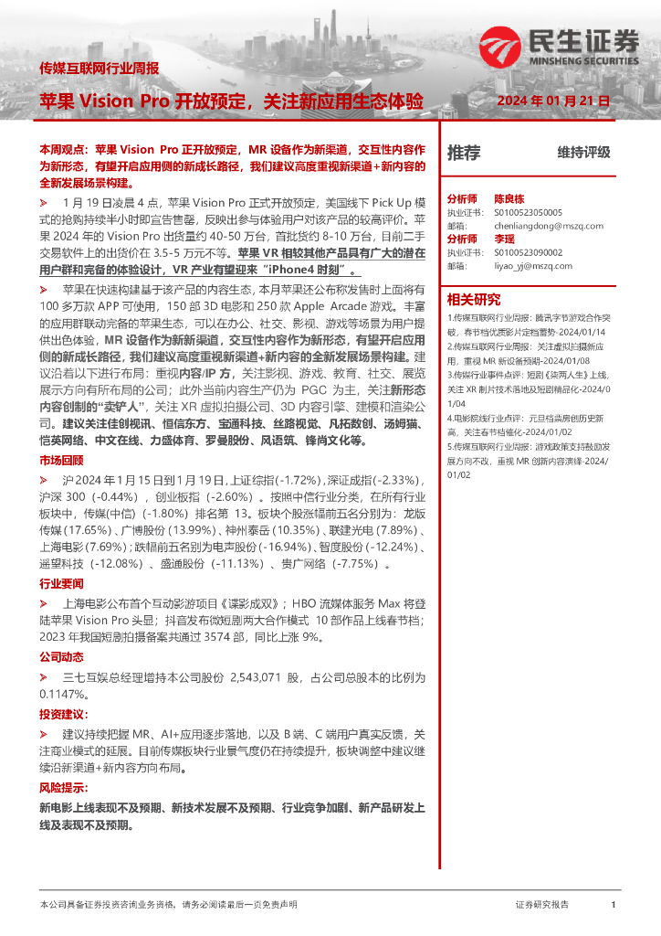 民生证券:传媒互联网行业周报:苹果Vision Pro开放预定,关注新应用生态体验.pdf
