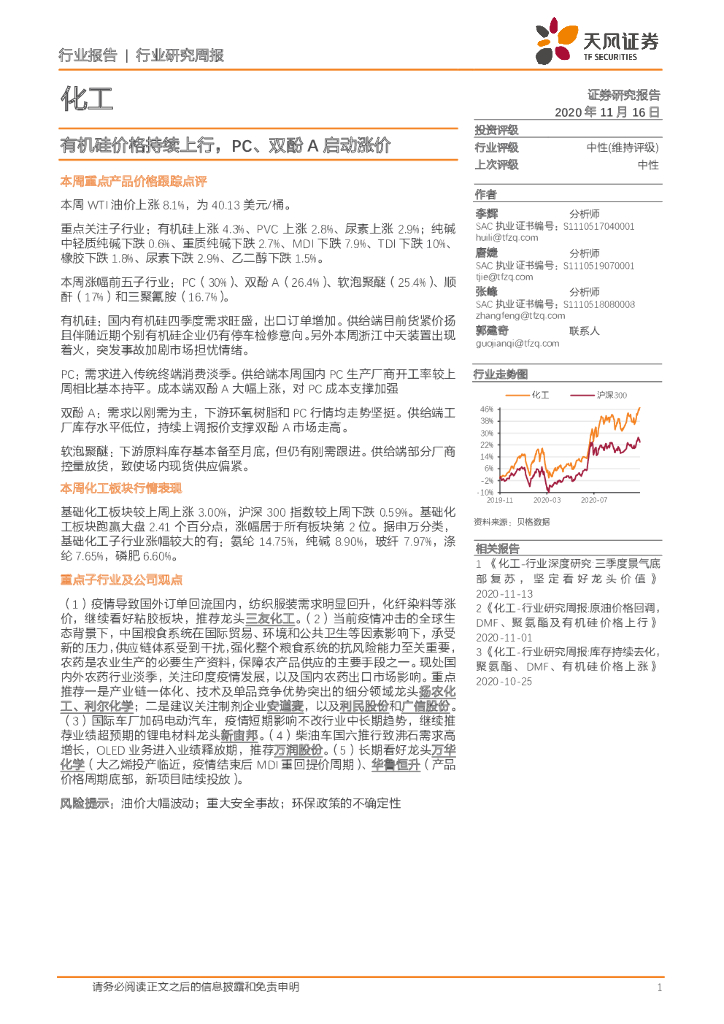 天风证券:化工行业研究周报:有机硅价格持续上行,PC、双酚A启动涨价.pdf