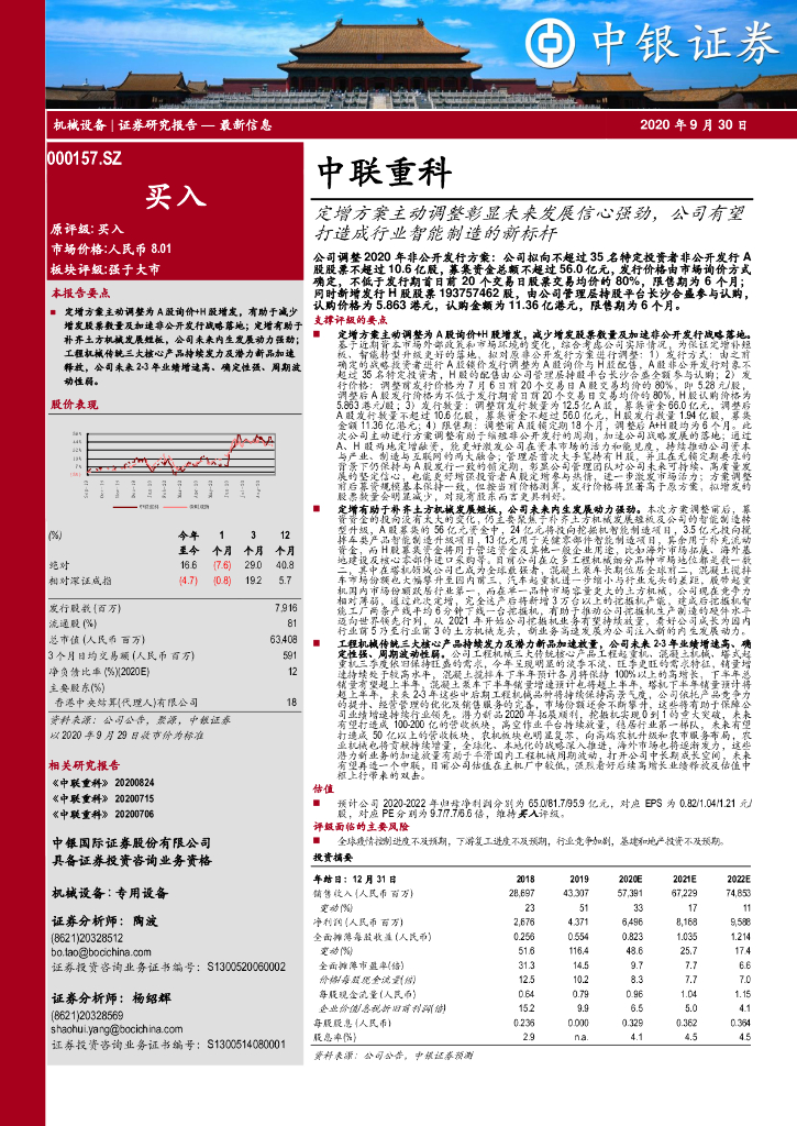 中银证券:中联重科(000157)-定增方案主动调整彰显未来发展信心强劲,公司有望打造成行业智能制造的新标杆.pdf