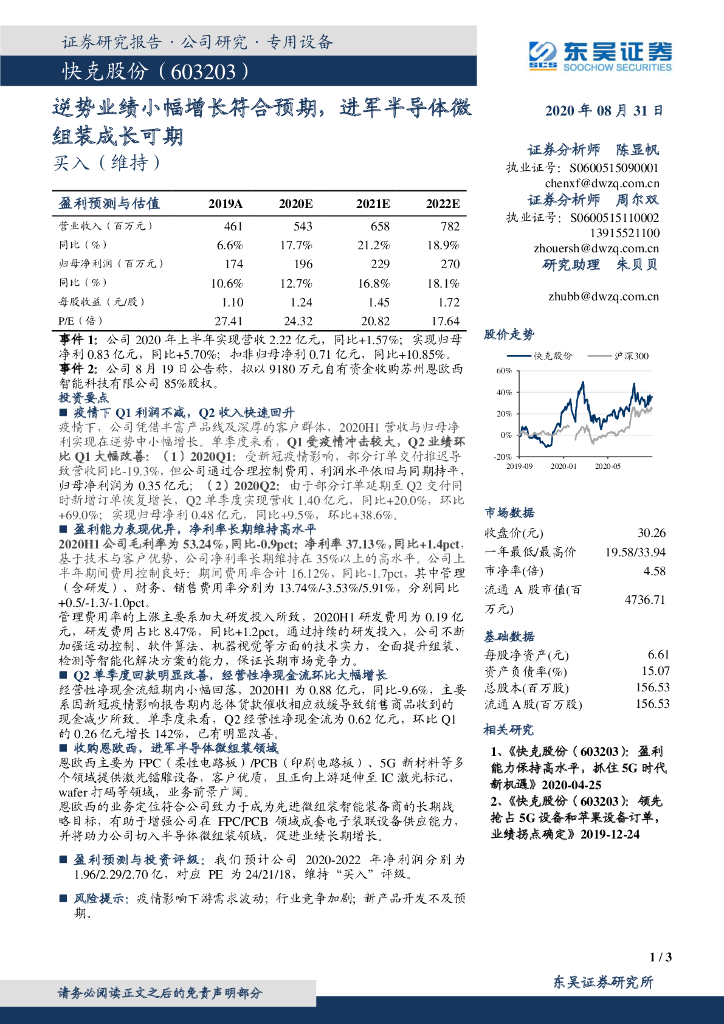 东吴证券:快克股份(603203)-逆势业绩小幅增长符合预期,进军半导体微组装成长可期.pdf