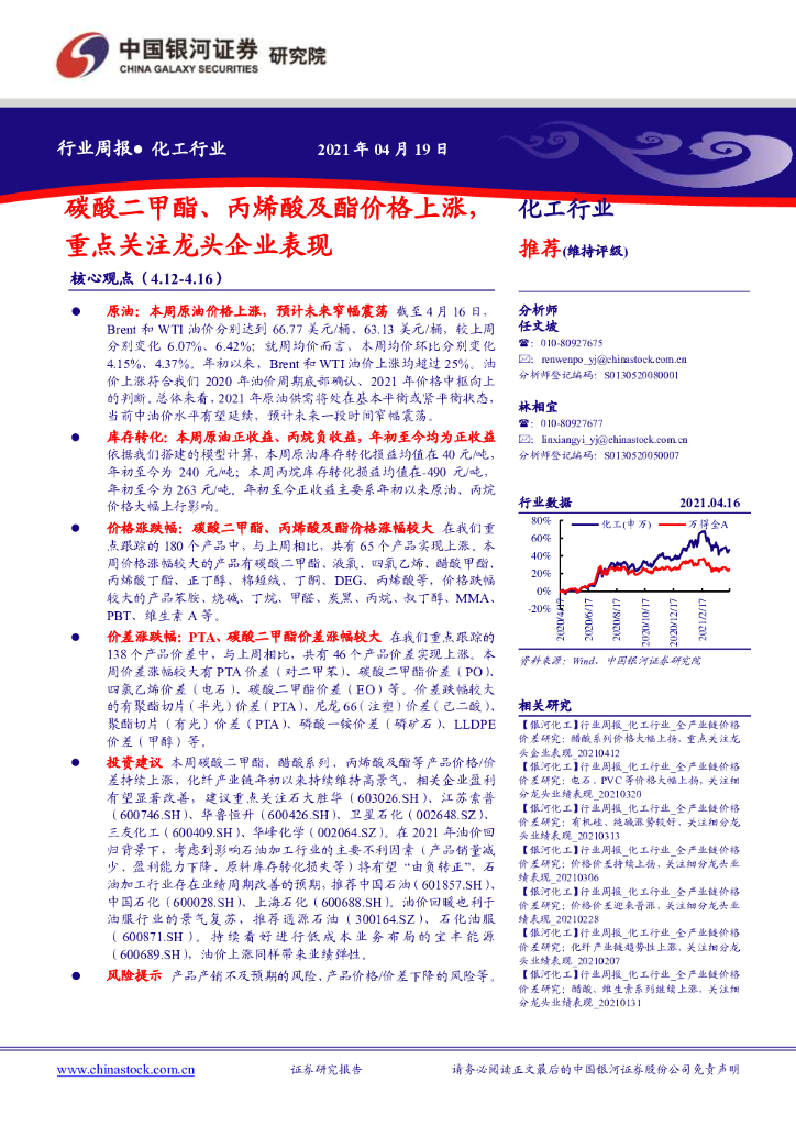 中国银河:化工行业周报:碳酸二甲酯、丙烯酸及酯价格上涨,重点关注龙头企业表现.pdf