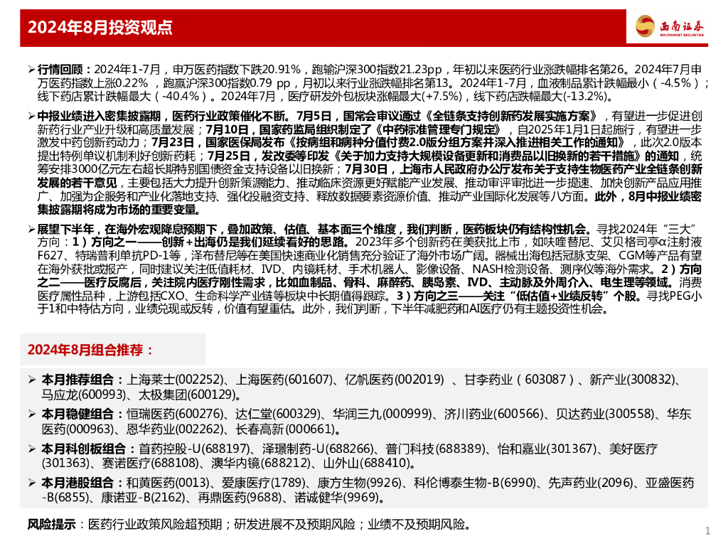 西南证券:医药行业2024年8月投资月报:看好医药三大方向.pdf