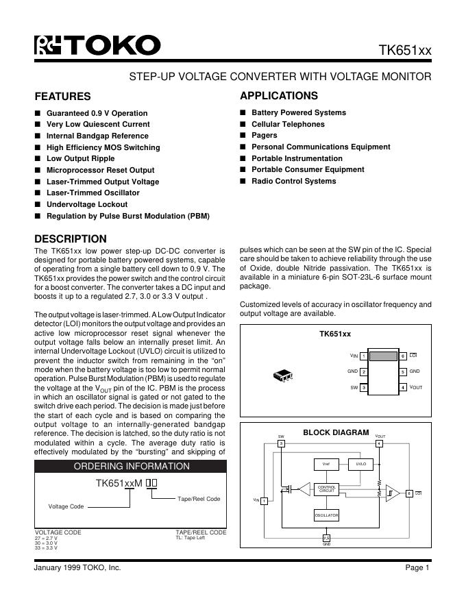 TOKO TK651xx STEP-UP VOLTAGE CONVERTER WITH VOLTAGE MONITOR 数据手册.pdf