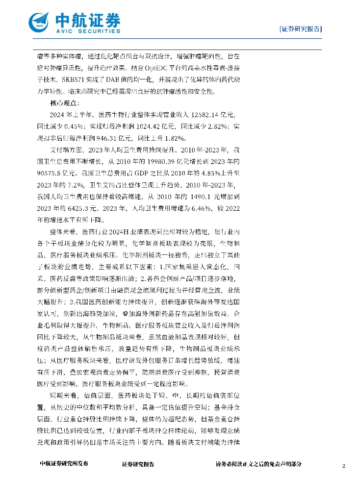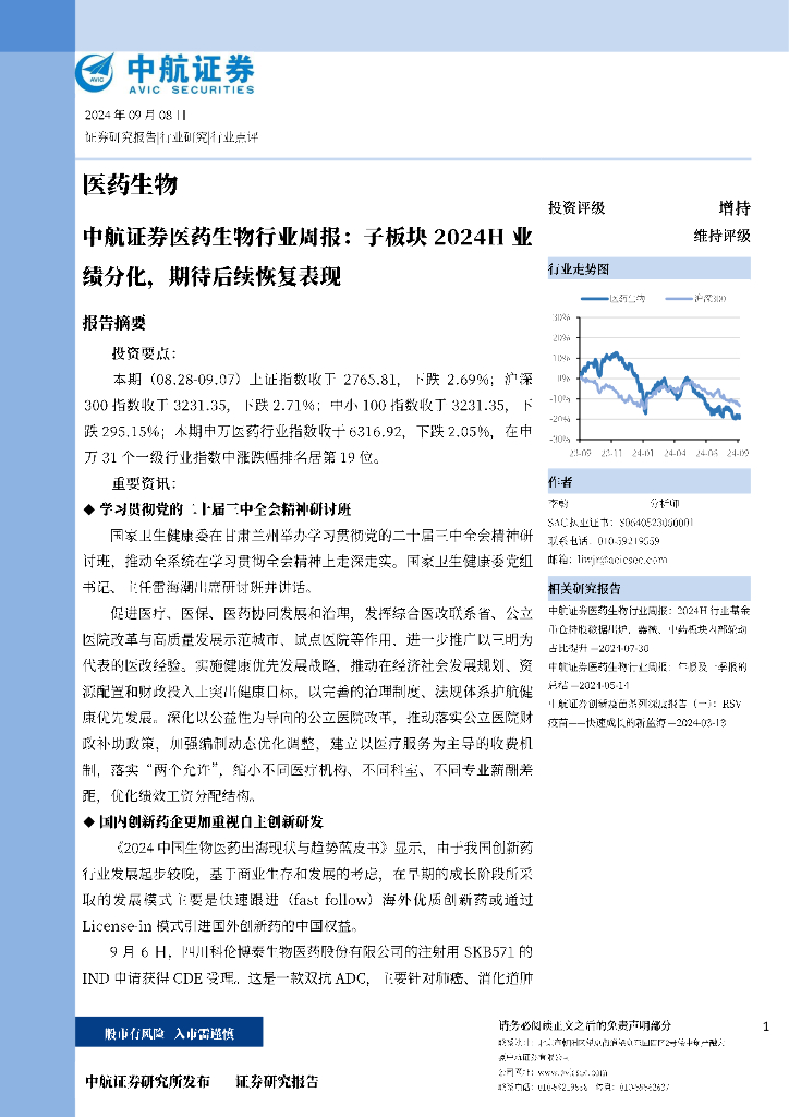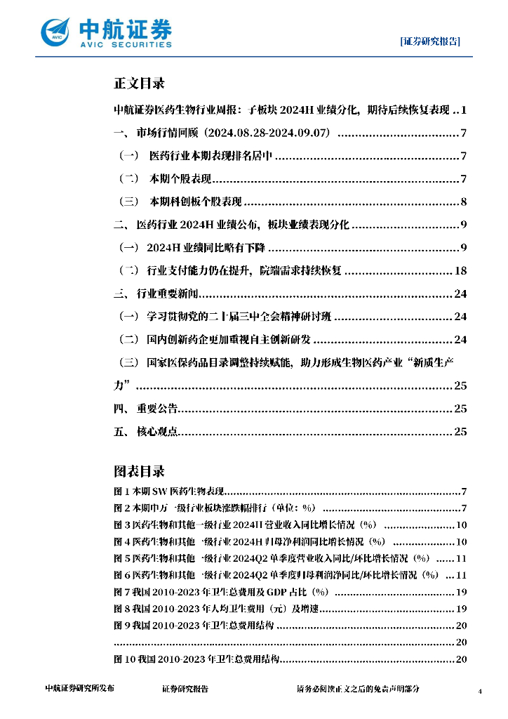 中航证券:医药生物行业周报:子板块2024H业绩分化,期待后续恢复表现.pdf