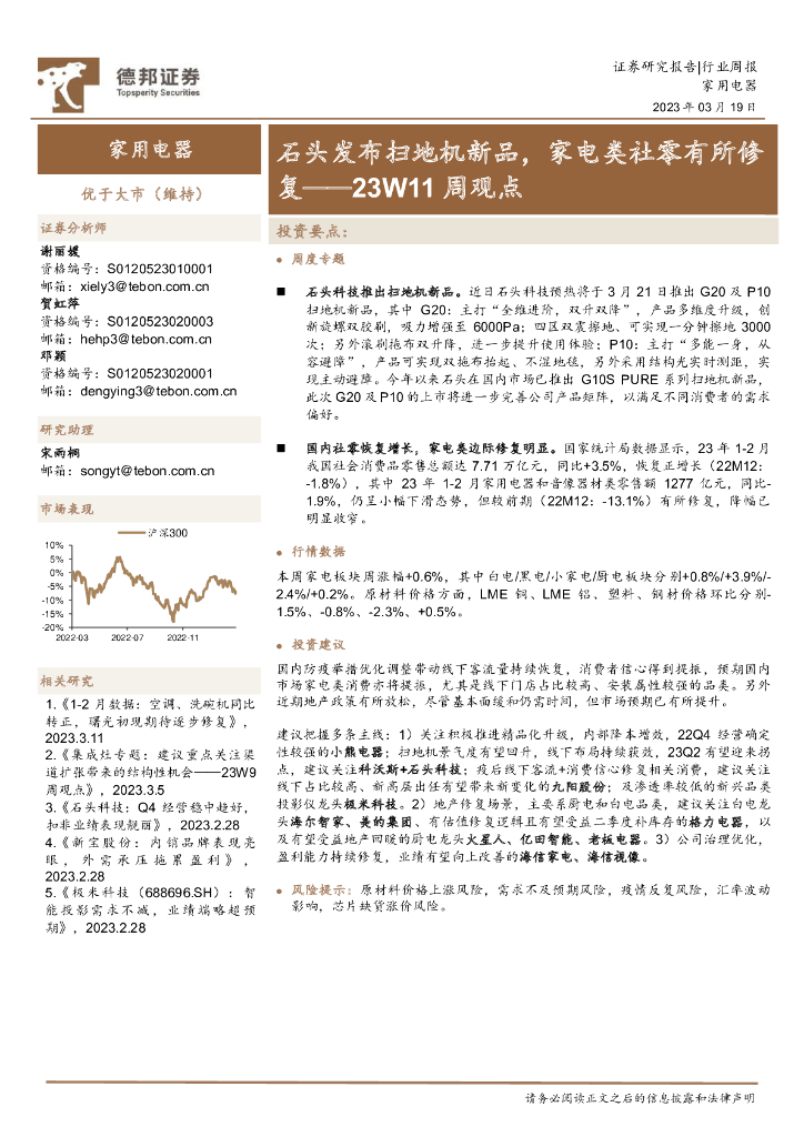 德邦证券:家用电器23W11周观点:石头发布扫地机新品,家电类社零有所修复.pdf