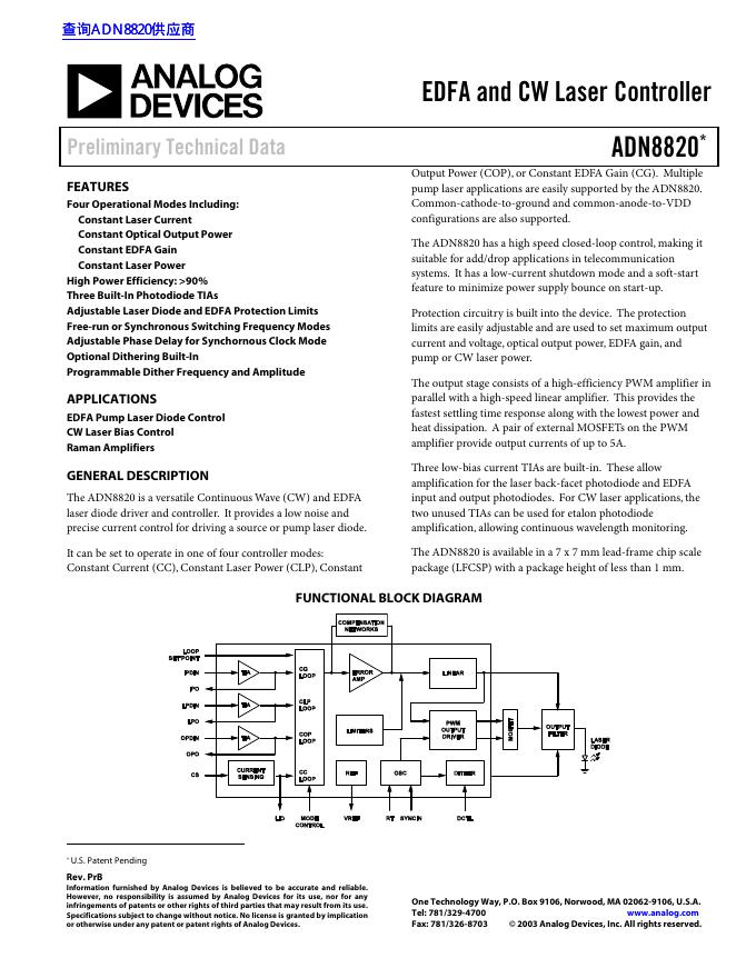 ANALOG DEVICES ADN8820 * EDFA and CW Laser Controller 数据手册.pdf