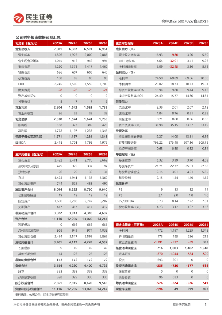 民生证券:舍得酒业(600702)-2024年半年报点评:主动调整控量稳价,利润有所承压.pdf