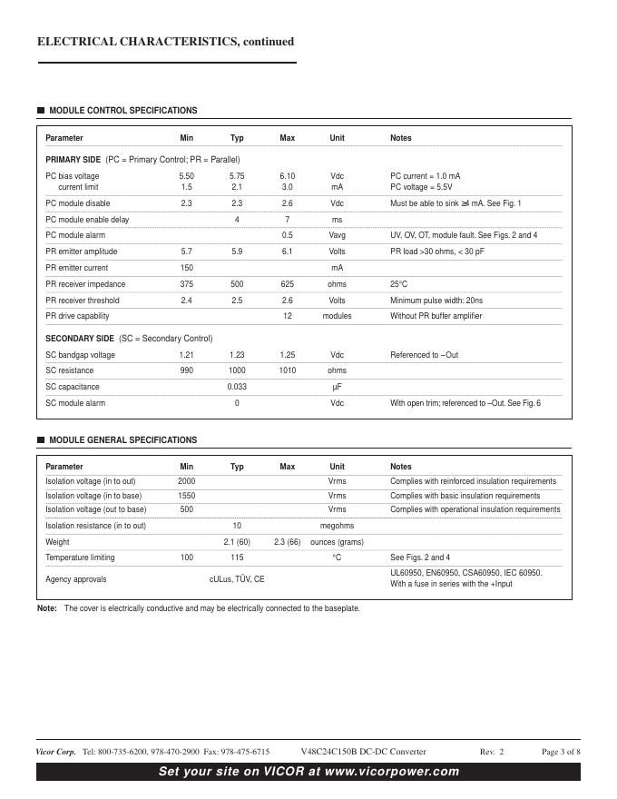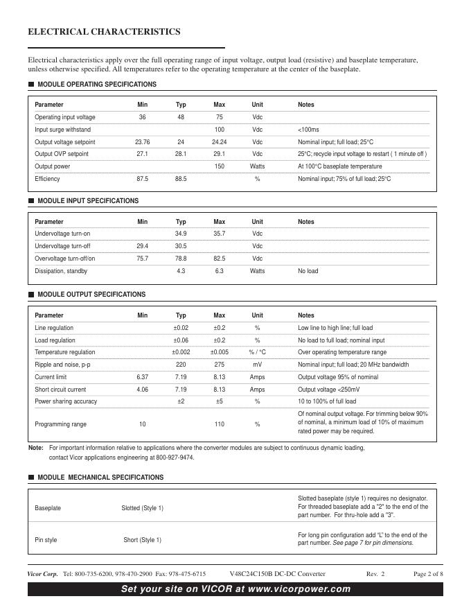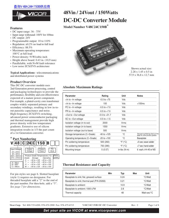 VICOR 48Vin / 24Vout / 150Watts DC-DC Converter Module Model Number V48C24C150B * 数据手册.pdf