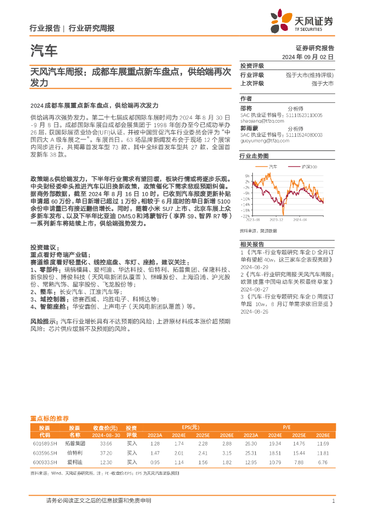 天风证券:汽车行业周报:成都车展重点新车盘点,供给端再次发力.pdf