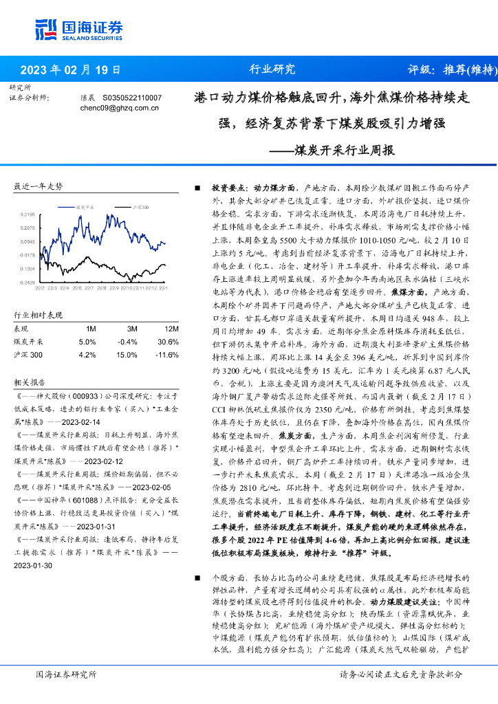 国海证券:煤炭开采行业周报:港口动力煤价格触底回升,海外焦煤价格持续走强,经济复苏背景下煤炭股吸引力增强.pdf