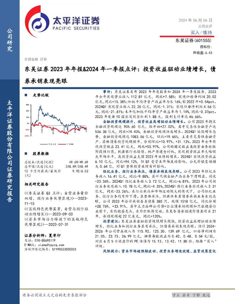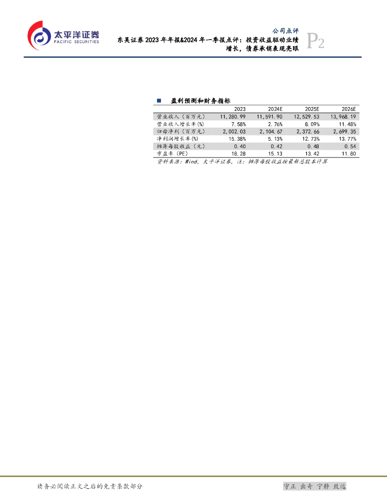 太平洋证券:东吴证券2023年年报&2024年一季报点评:投资收益驱动业绩增长,债券承销表现亮眼.pdf