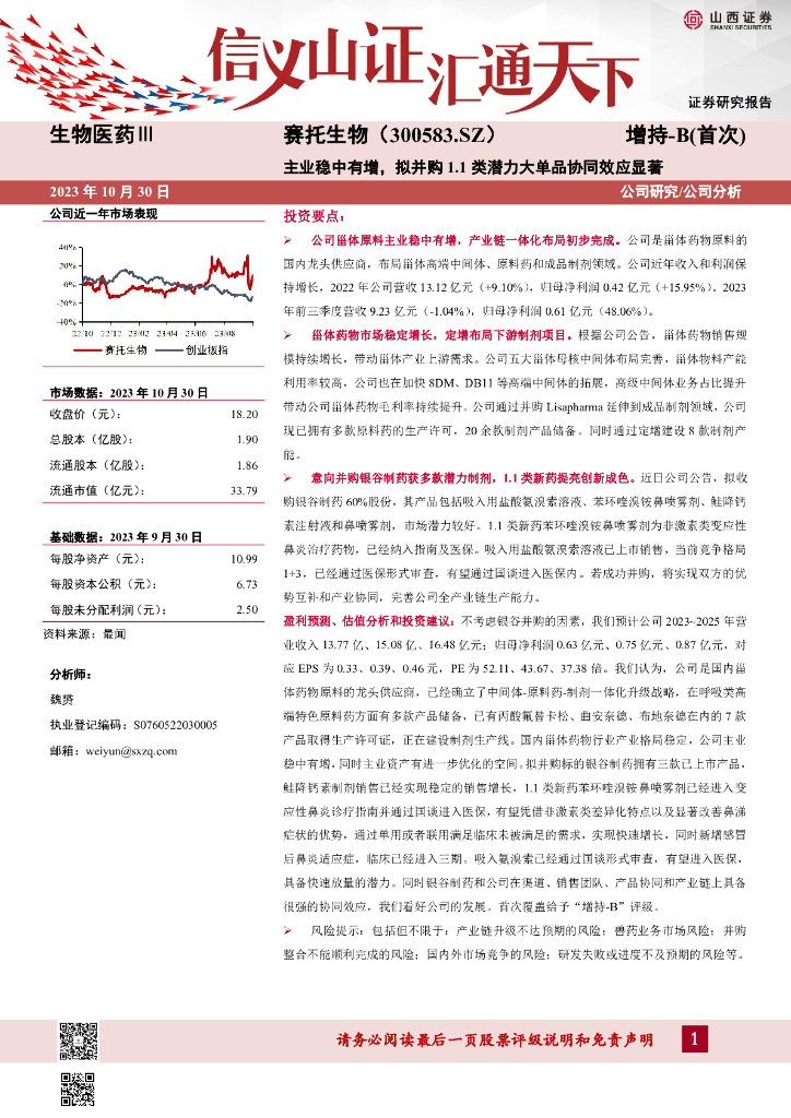 山西证券:赛托生物(300583)-主业稳中有增,拟并购1.1类潜力大单品协同效应显著.pdf