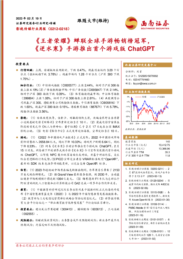 西南证券:影视传媒行业周报:《王者荣耀》蝉联全球手游畅销榜冠军,《逆水寒》手游推出首个游戏版ChatGPT.pdf