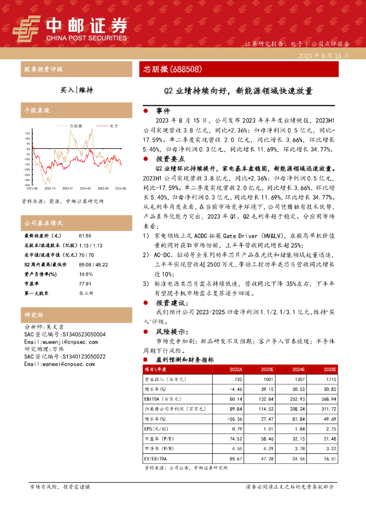中邮证券:芯朋微(688508)-Q2业绩持续向好,新能源领域快速放量.pdf