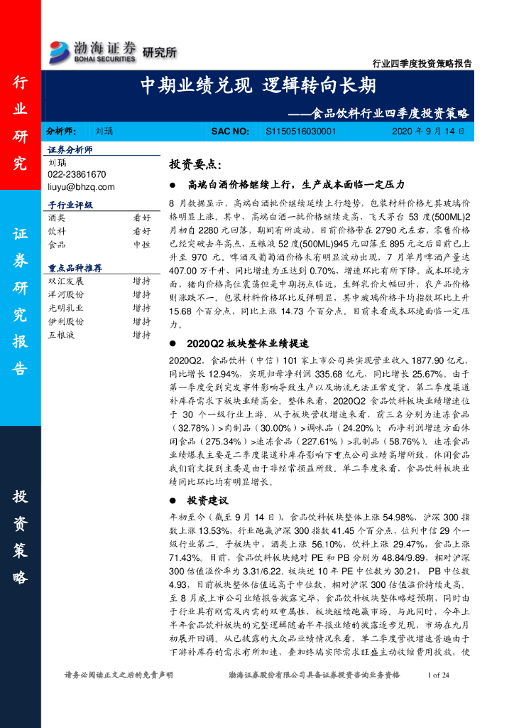 渤海证券:食品饮料行业四季度投资策略:中期业绩兑现 逻辑转向长期.pdf