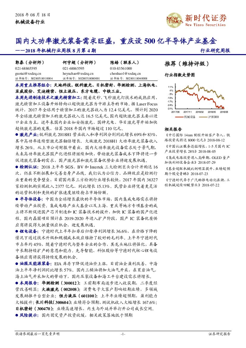 新时代证券:2018年机械行业周报8月第4期:国内大功率激光装备需求旺盛,重庆设500亿半导体产业基金.pdf