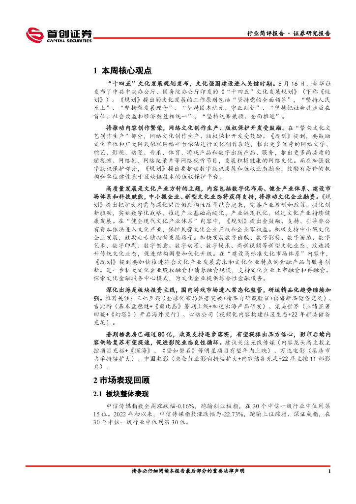 首创证券:传媒行业简评报告:“十四五”文化规划发布,产业主题为高质量发展.pdf