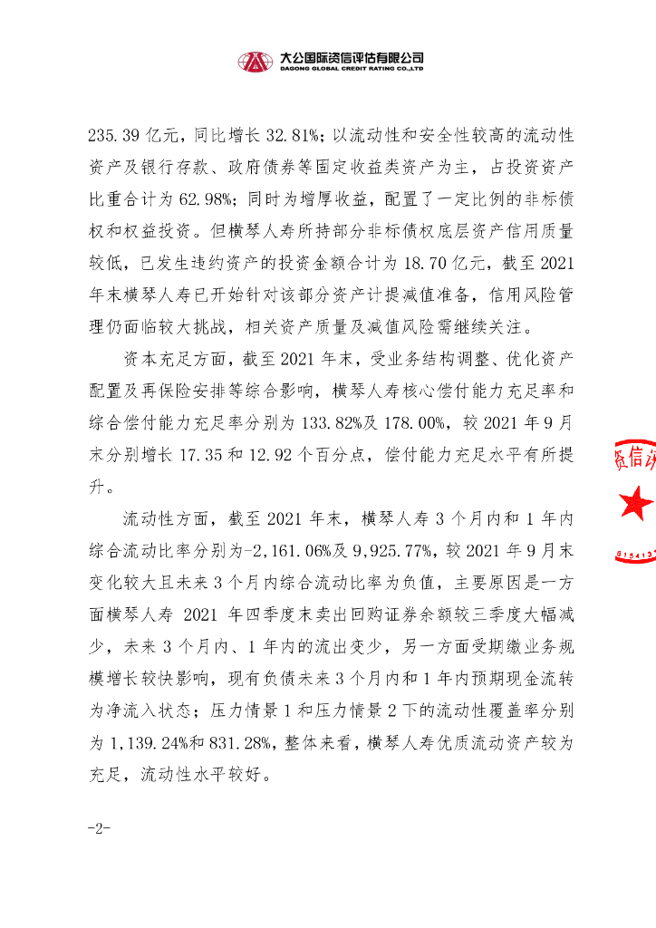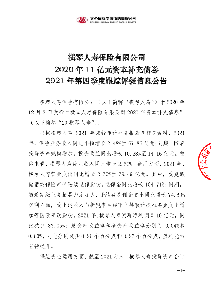 大公:横琴人寿保险有限公司2020年11亿元资本补充债券2021年第四季度跟踪评级信息公告.pdf