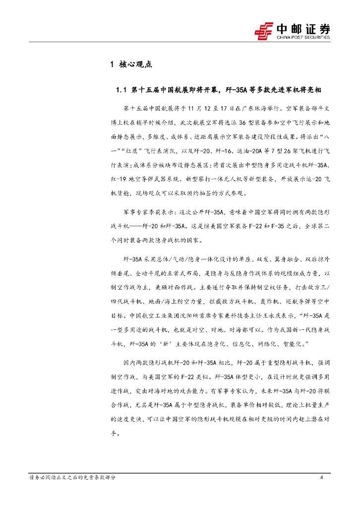 中邮证券:国防军工行业报告:第十五届中国航展即将开幕,歼-35A等多款先进军机将亮相.pdf