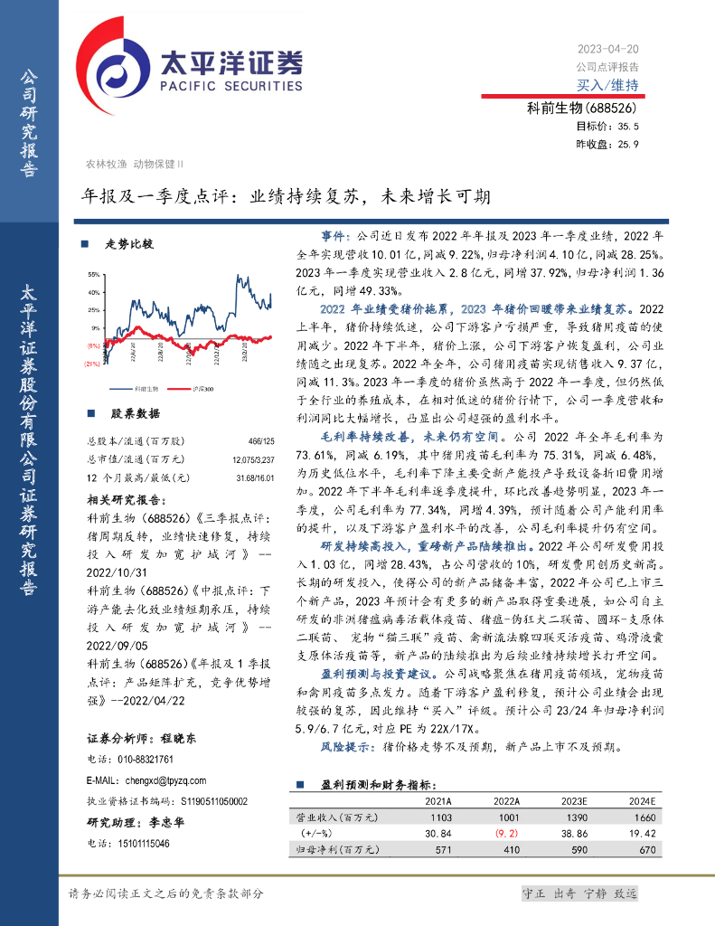 太平洋证券:科前生物(688526)-年报及一季度点评:业绩持续复苏,未来增长可期.pdf