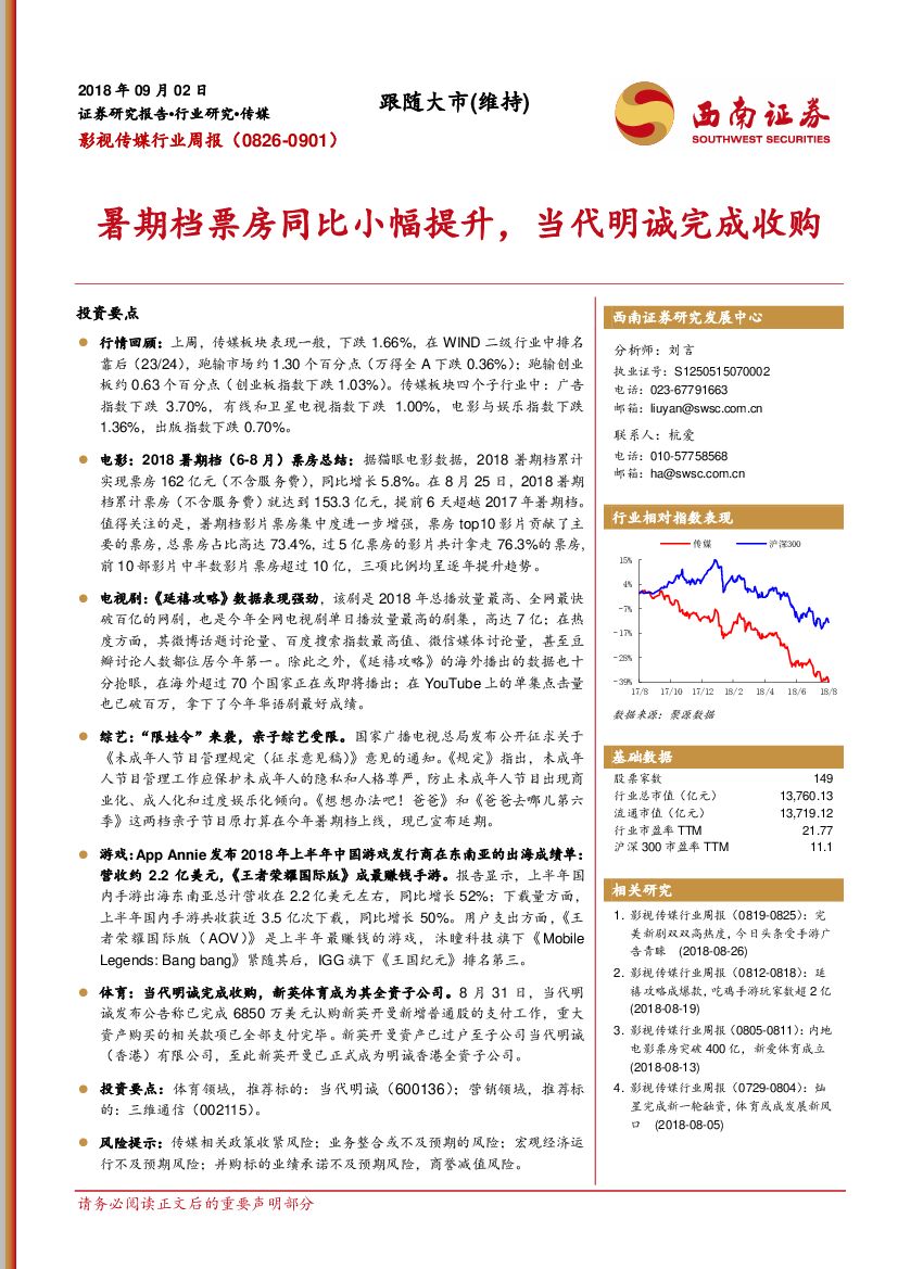西南证券:影视传媒行业周报:暑期档票房同比小幅提升,当代明诚完成收购.pdf