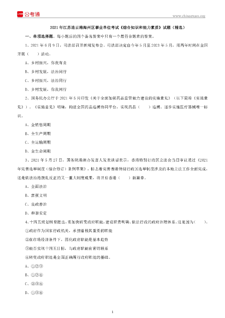 2021年江苏连云港海州区事业单位考试《综合知识和能力素质》试题(精选).pdf