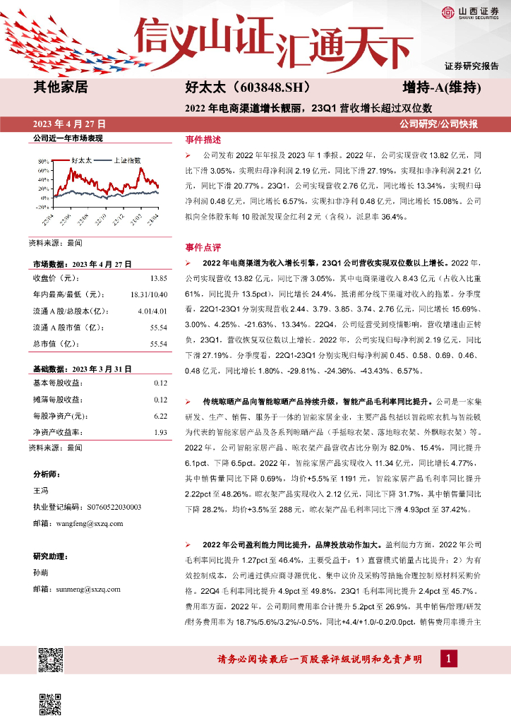 山西证券:好太太(603848)-2022年电商渠道增长靓丽,23Q1营收增长超过双位数.pdf