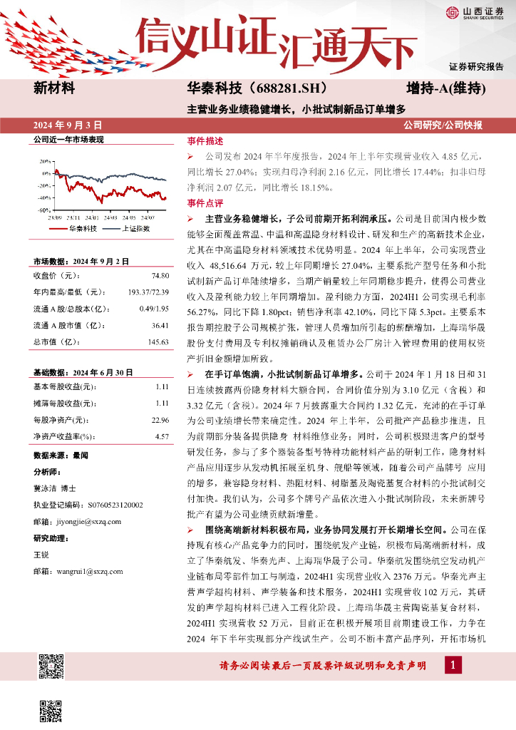 山西证券:华秦科技(688281)-主营业务业绩稳健增长,小批试制新品订单增多公司研究/公司快报.pdf