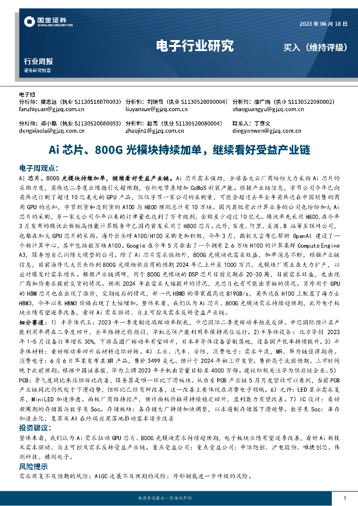 国金证券:电子行业周报:Ai芯片、800G光模块持续加单,继续看好受益产业链.pdf