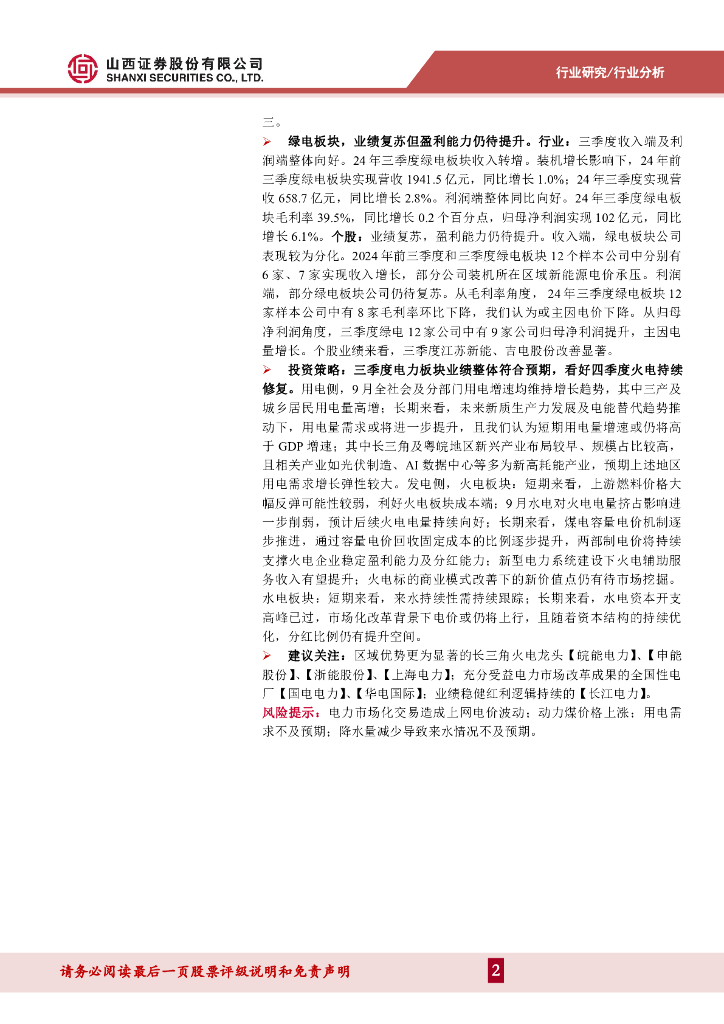 山西证券:电力行业2024年三季报综述:供需两旺,火电改善超预期.pdf