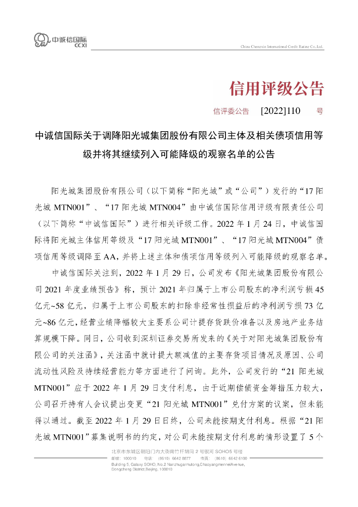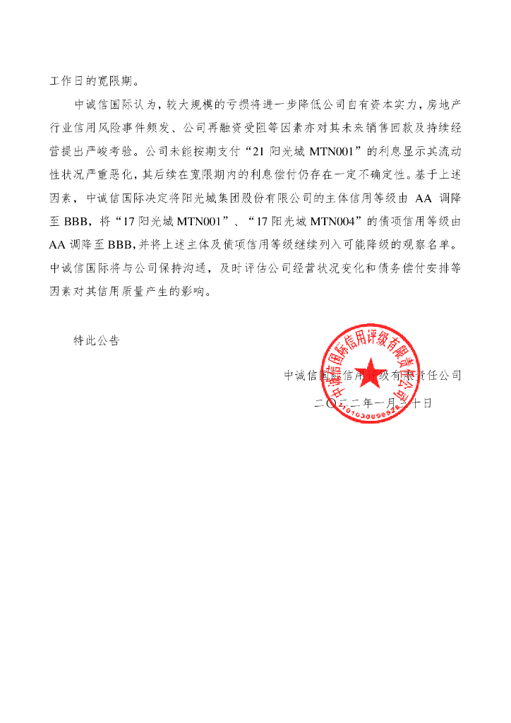 中诚信:中诚信国际关于调降阳光城集团股份有限公司主体及相关债项信用等级并将其继续列入可能降级的观察名单的公告.pdf