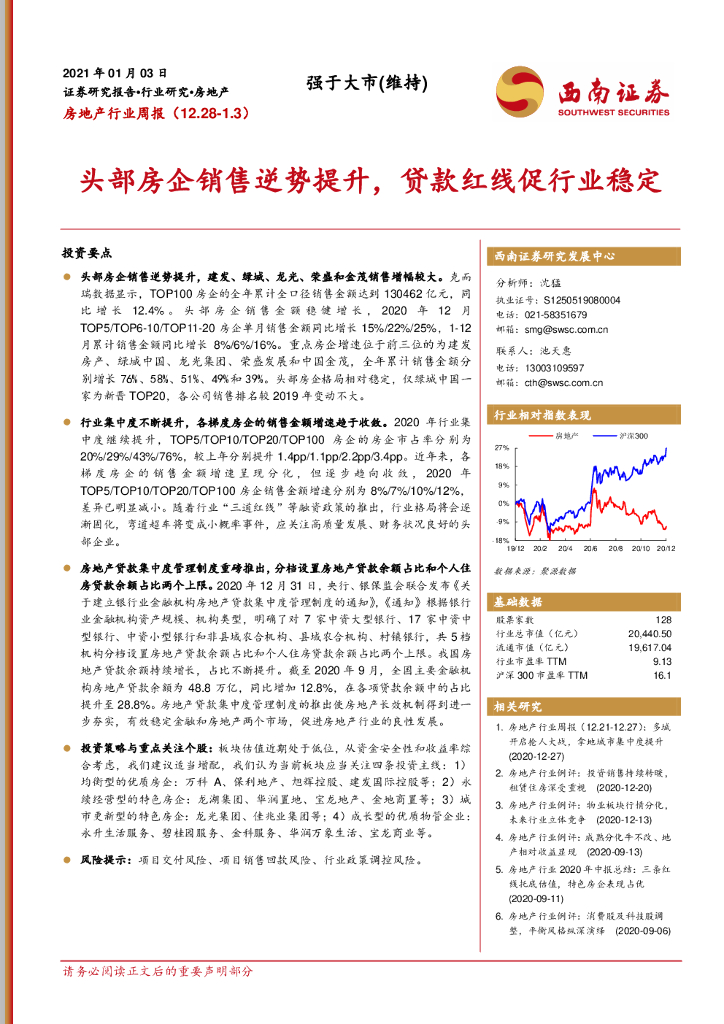 西南证券:房地产行业周报:头部房企销售逆势提升,贷款红线促行业稳定.pdf