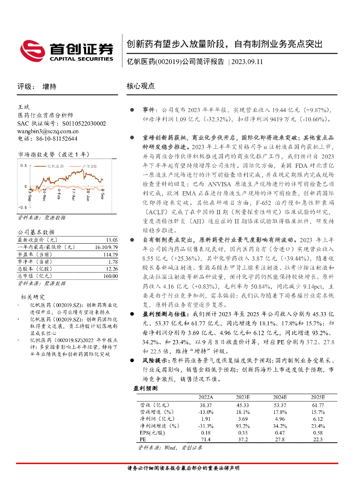 首创证券:亿帆医药(002019)-公司简评报告:创新药有望步入放量阶段,自有制剂业务亮点突出.pdf