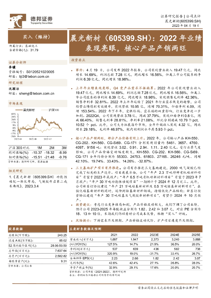 德邦证券:晨光新材(605399)-2022年业绩表现亮眼,核心产品产销两旺.pdf
