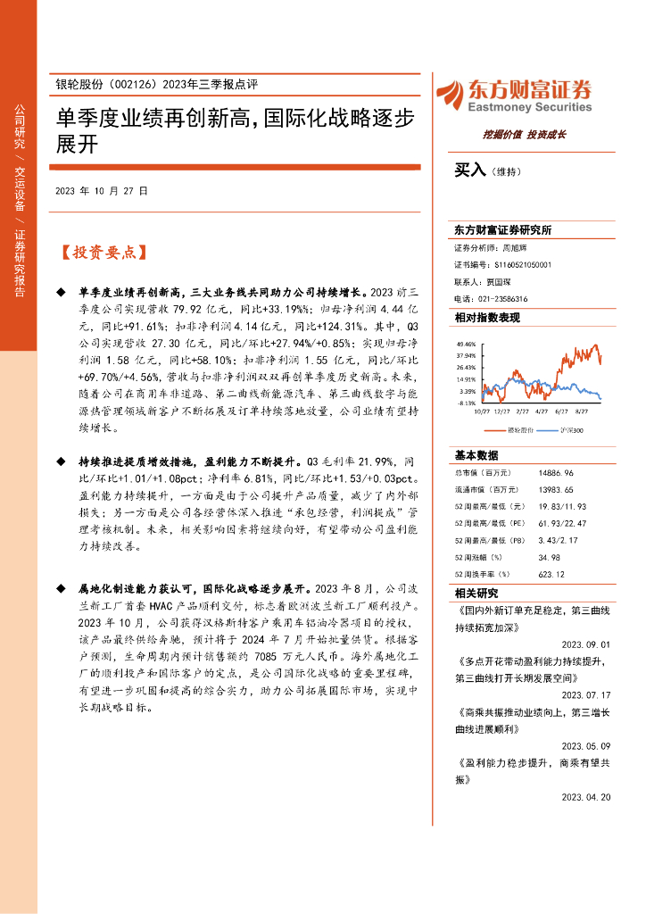 东方财富证券:银轮股份(002126)-2023年三季报点评:单季度业绩再创新高,国际化战略逐步展开(2023-10-27).pdf