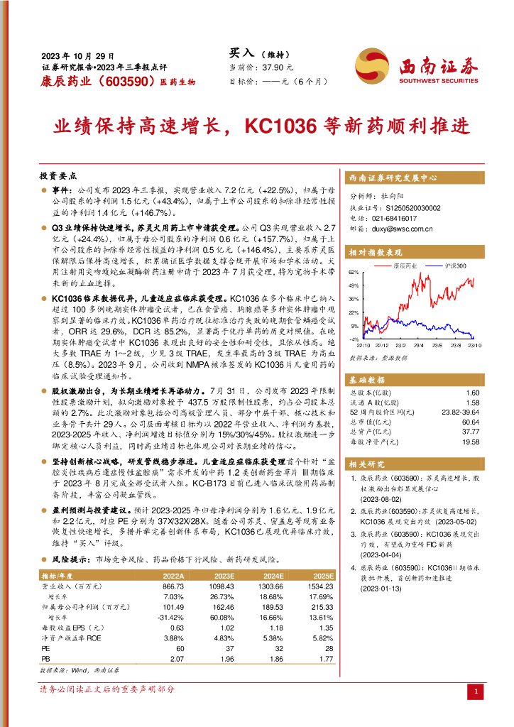 西南证券:康辰药业(603590)-2023年三季报点评:业绩保持高速增长,KC1036等新药顺利推进.pdf