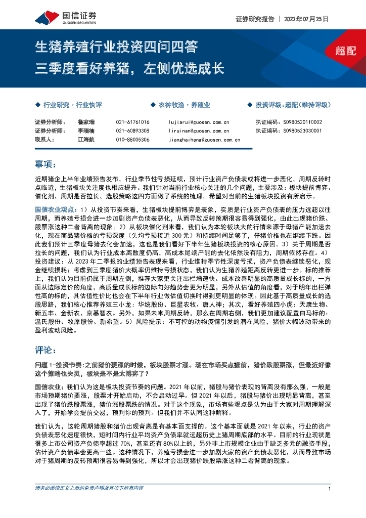 国信证券:生猪养殖行业投资四问四答:三季度看好养猪,左侧优选成长.pdf