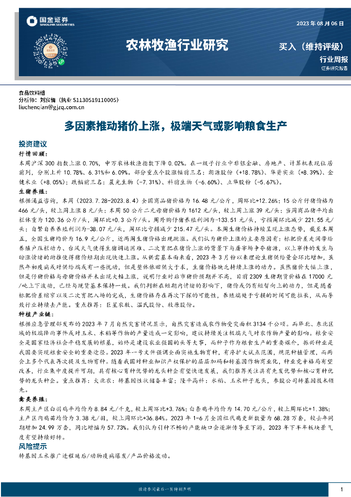 国金证券:农林牧渔行业研究:多因素推动猪价上涨,极端天气或影响粮食生产.pdf