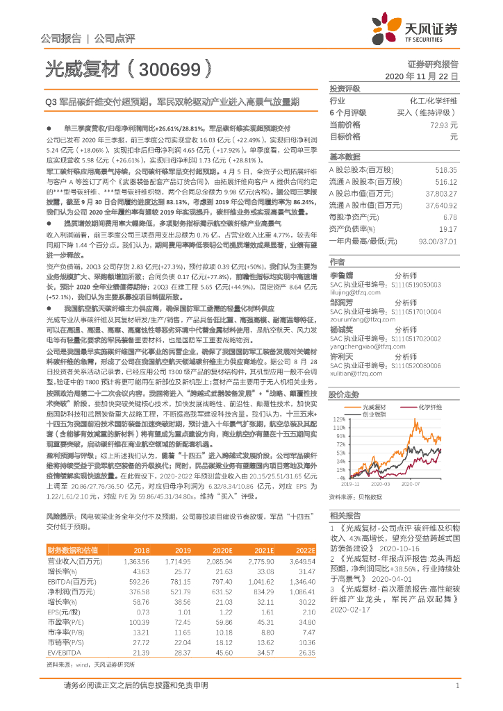 天风证券:光威复材(300699)-Q3军品碳纤维交付超预期,军民双轮驱动产业进入高景气放量期.pdf