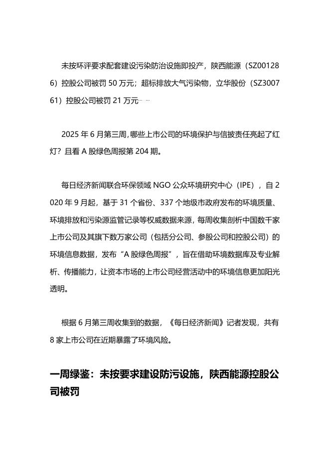 A股绿色周报(2025年第204期):8家上市公司暴露环境风险 陕西能源控股公司项目未按环评要求建设被罚50万元.pdf