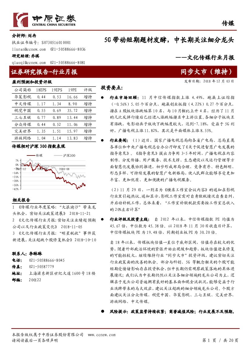 中原证券:文化传媒行业月报:5G带动短期题材发酵,中长期关注细分龙头.pdf
