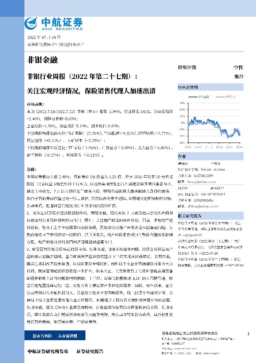 中航证券:非银行业周报(2022年第二十七期):关注宏观经济情况,保险销售代理人加速出清.pdf